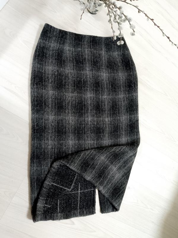 Шерстяная теплая юбка в клетку миди. Цвет черный, серый. Размер не указан. Этикеток и турок не имеет. Может быть М. Линия талии 40 см. Линия бедер 52 см. Ширина внизу 52 см. Общая длина 82 см. Сзади разрез 32 см. Сбоку застежка молния и петелька.