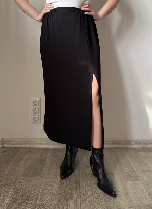 Юбка длины миди, черного цвета Имеет очень красивый разрез спереди 😍 В составе полиэстер Длина 88 см, полуобхват талии 40 см( тянется до 47 см, резинка на талии), полуобхват бедер 56 см Стан - идеальный