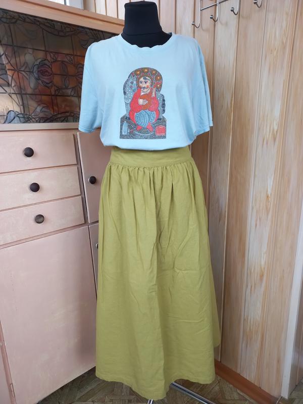 Легкая летняя юбка оливкового цвета. Ткань на 88% из хлопка и 12% льна - идеальный вариант для жаркого лета. Застегивается на молнию. Без подкладки. Цвет ближе к последним 2-м фото. Можно их стилизировать под народный стрий. Замеры: Полуобхват талии (ткань не тянется!): 40 см. Длина: 86 см. мідаксі