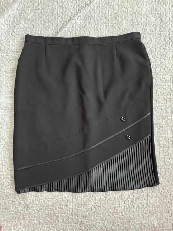 Юбка на подкладке черного цвета, по низу с асимметричными рюшами и имеет две пуговицы со стороны в качестве декорации, ориентировано 54-56, без дефектов, состояние идеально. Замеры: пояс на пуговице и замочке - 52, бедра-63, длина-67