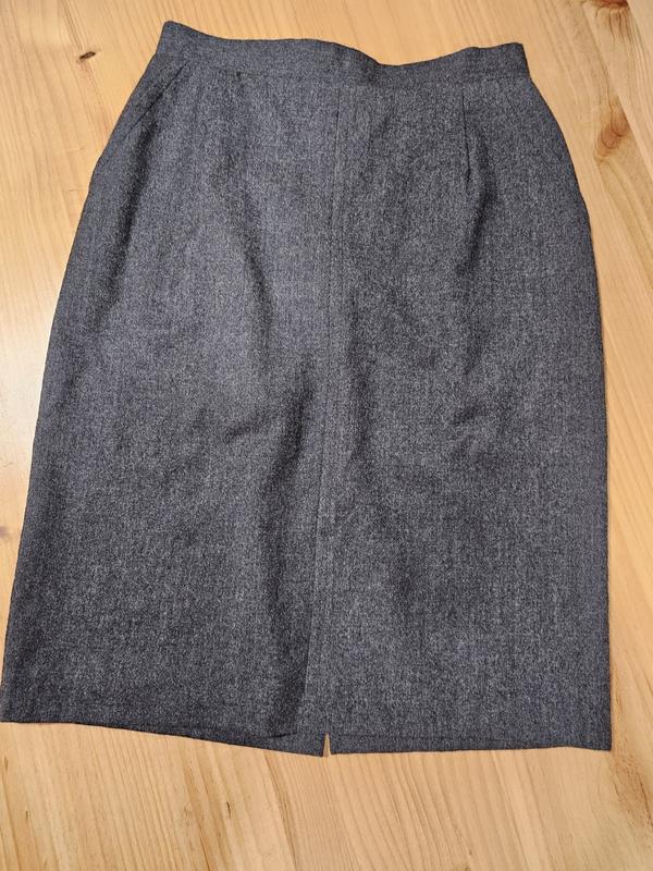 шерстяная юбка St.Michael с шлицей размер 44, имеет два боковых кармана, серого цвета классическая юбка карандаш актуальна во все времена, сочетать можно с водолазками, футболками, объемными свитерами, с майками и с рубашками. замеры: полуобъем талии- 39см полуобем бедер- 56см ширина юбки по низу-108см
