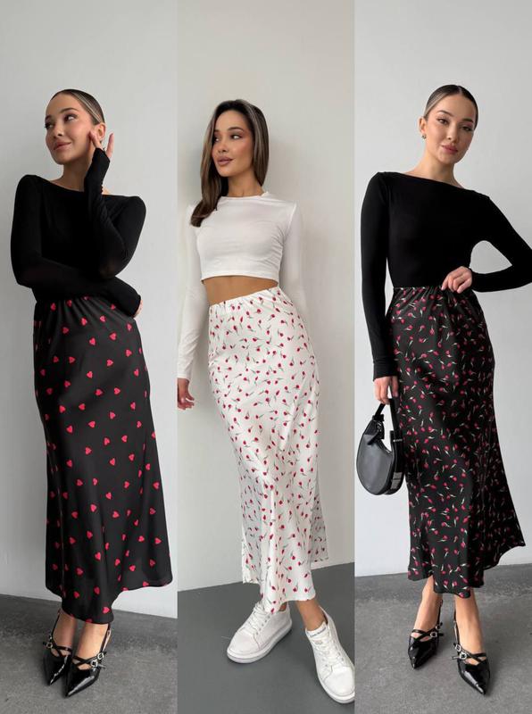 Шелковая миди юбка с принтом горох и цветы, шёлковая юбка мышки