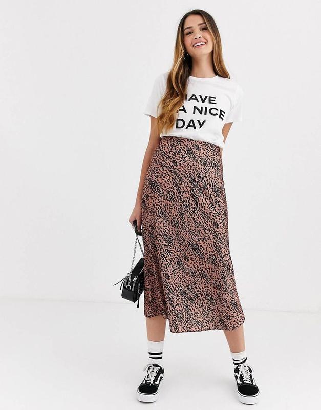 Юбка коричневая атласная миди а силуэт трапеция абстракци животный принт new look