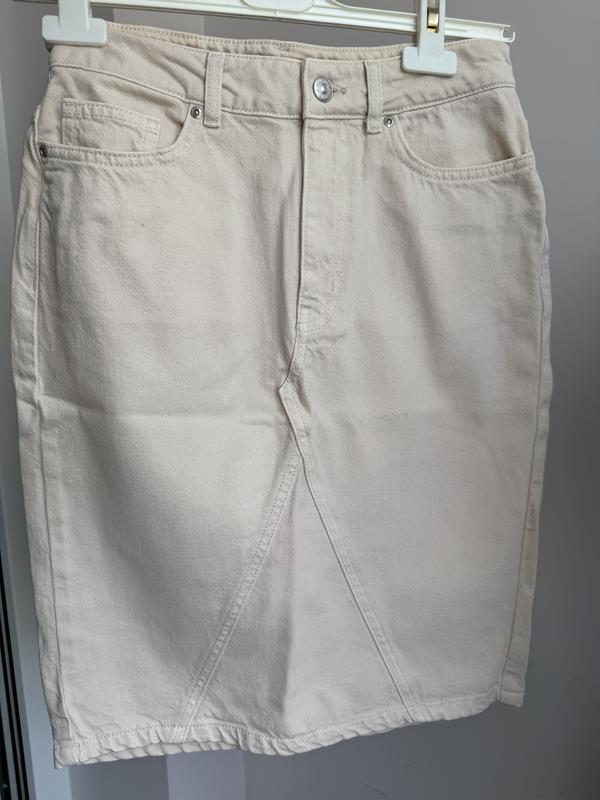 Спідниця джинсова , гарної якості. Не тягнеться!!! довжина 53см напівобхват пояс 34см напівобхват стегон 43см бежевий колір Стан нової, не одягала . Лежить без діла)