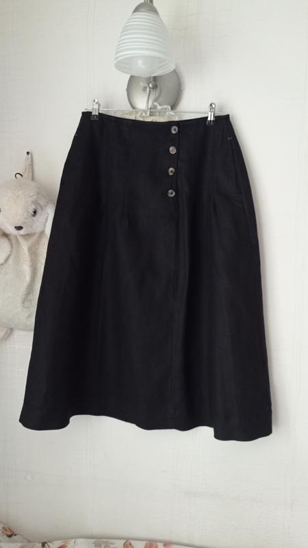Замечательная льняная юбочка в состоянии новой вещи, асимметричная застежка, два внутренних кармана, не сковывает движения, потому что же обиходена. Интересный крой, показала внутреннюю сторону на фото. Без подкладки. Размер по набору - 10, 38. Тяжеленькая, ткань достаточно плотная, лён качественный, цвет - черный насыщенный. Талия - 38, может сесть на бедра и будет тоже замечательно. Бедра - 53, длина - 79.