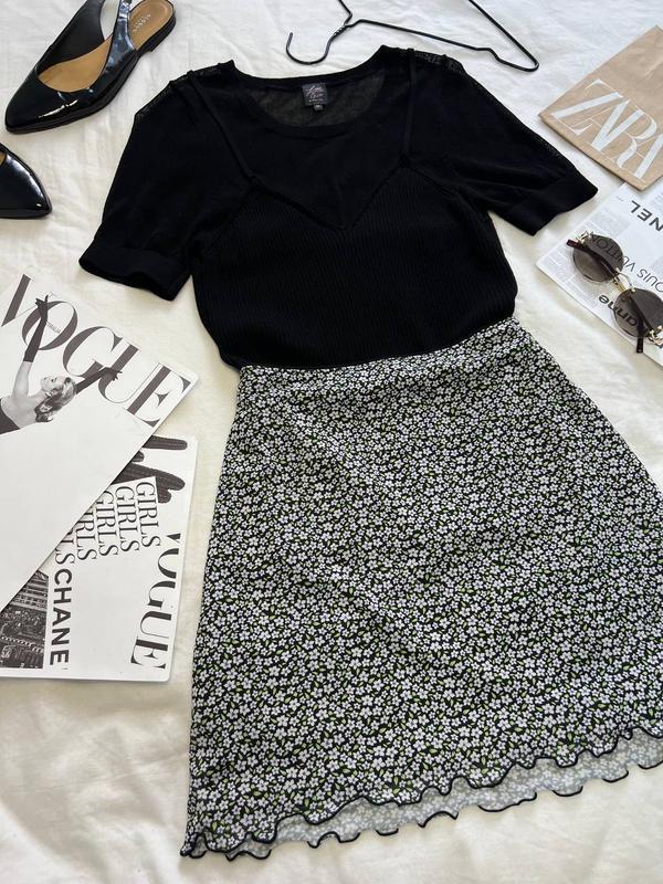 Топ в сіточку поверх з імітацією майки дуже стильно дивиться,стан ідеальний,розмір С-М, спідничка дуже ніжна та легка,розмір М