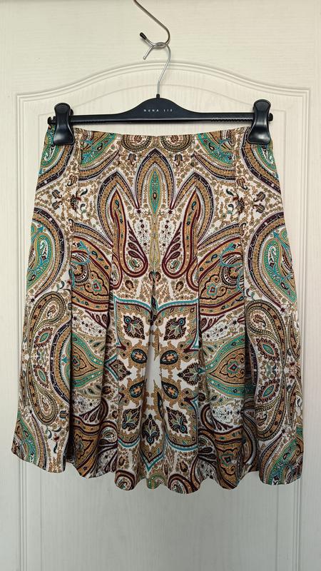 Дизайнерская юбка-миди с узором пейсли и встречными складками от Marc Aurel. Застегивается на пуговицу и потайную молнию. На поясе есть шлевки (3 см), можно носить с кожаным ремешком. Юбка на подкладке. Состав: 100% натуральный шелк, подкладка 100% полиэстер. Размер указан 36. Обратите внимание на замеры: Полуобхват талии - 39 см Длина - 55 см