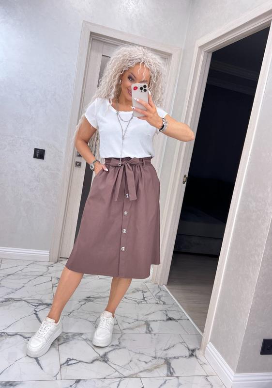 Юбка "Джанни" Юбка идет в комплекте с поясом. Талия на резинке. По бедрам свободного кроя, что придаст вашему образу легкости, при этом скроет все недостатки и создаст изысканный силуэт. Спереди украшена планкой с декорированными пуговицами. Материал: джинс коттон стрейчевый (люкс качества) Размеры: 42-44, 46-48, 50-52, 54-56 Цвета: шоколад, бежевый, молочный, мята, сливовый, джинс Цена: 640 грн