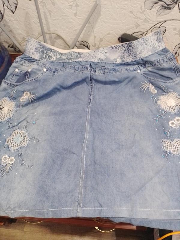 состояние идеальное 54-56рр , ткань летний джинс то что нужно на лето .в жизни голубой насыщенный цвет фото 4 , .длина спереди 55см заде 63 см , пот 49 см и тянется до 62 см , поб 66 см .