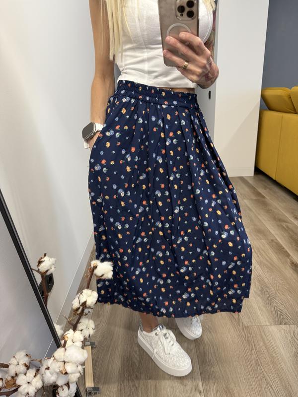 Rehli, розмір S ▪️безпечна покупка через НП, Укрпошту ▪️синя, квіточки оранжеві блакитні та жовті ▪️пояс з резинкою, без застібки; один карман збоку ▪️заміри: Пот 34-41 ПОС 80+ Довжина 70