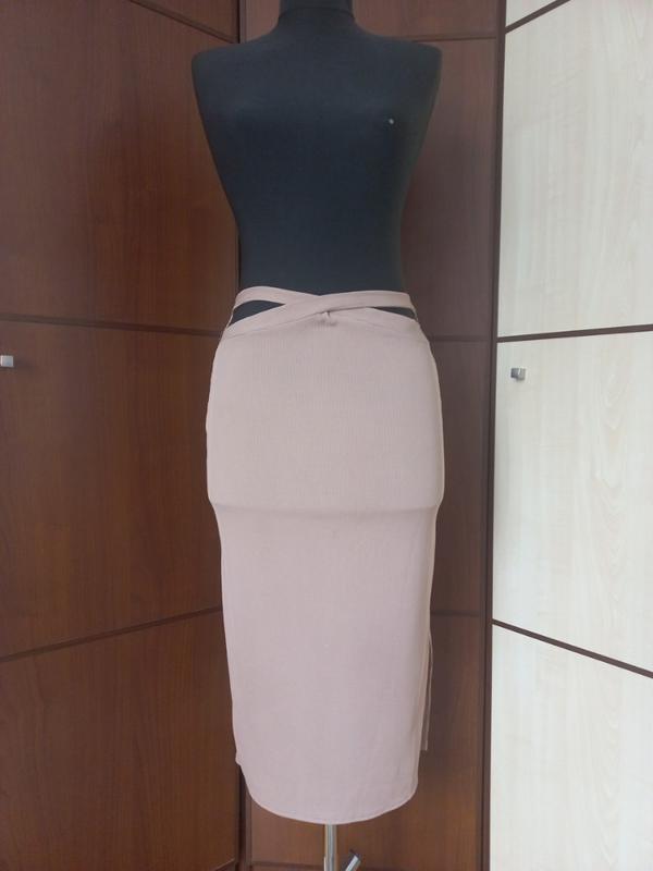 миди- юбка в рубчик, сбоку имеет разрез, на талии интересные катауты. Розмір по бірці L, але може сісти і на M