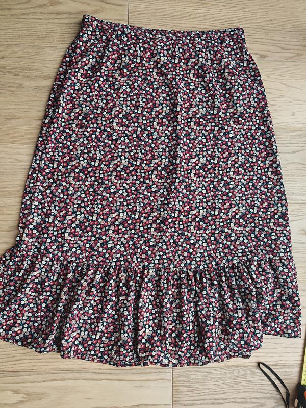 🌸 Жіноча спідниця міді з квітковим принтом від JDY 🖤 Колір: Темна основа (імовірно, чорний або темно-синій) з яскравим дрібним квітковим принтом у відтінках рожевого, червоного, білого та зеленого. 👗 Стиль: Романтична спідниця довжини міді (нижче коліна) вільного крою, з еластичним поясом на талії та милим рюшем по нижньому краю. 📏 Розмір: Орієнтуйтесь на заміри, оскільки пояс еластичний, підійде на кілька розмірів. 🔸 Матеріал: 97% поліестер та 3% еластан. Дуже приємна до тіла та не мнеться. 🔸 Стан: Дуже добрий. Без видимих дефектів чи пошкоджень. 🔸 Бренд: JDY 📏 Заміри (зроблено по спідниці): Довжина по боковому шву (від верху пояса до нижнього краю рюша): ~78 см Ширина пояса (у нерозтягнутому стані): ~35 см Ширина пояса: ~ 45 см Ширина по низу (приблизно, без врахування рюша): ~63 см