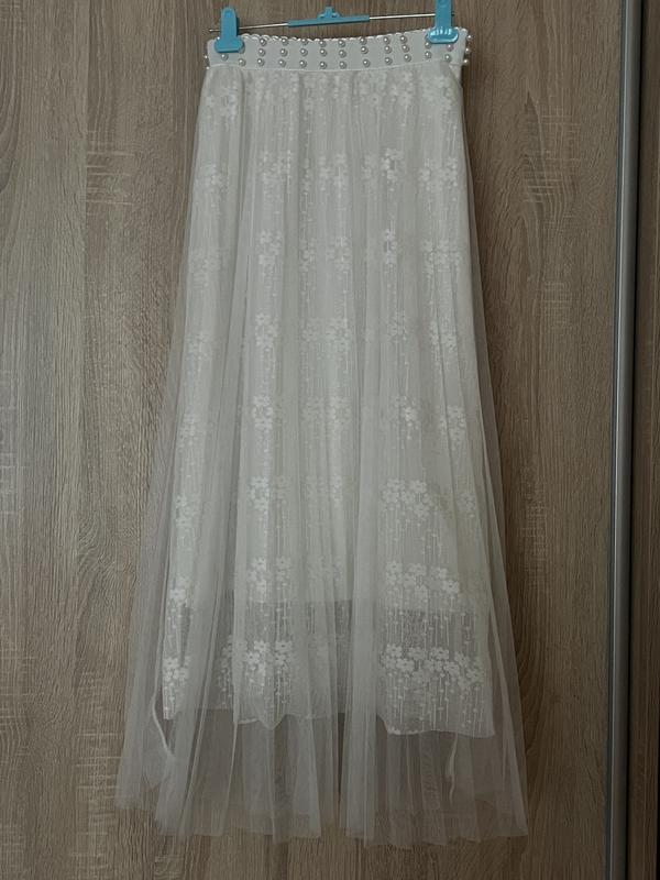 Спідниця міді білого кольору на резинці з перлинками Розмір S-M