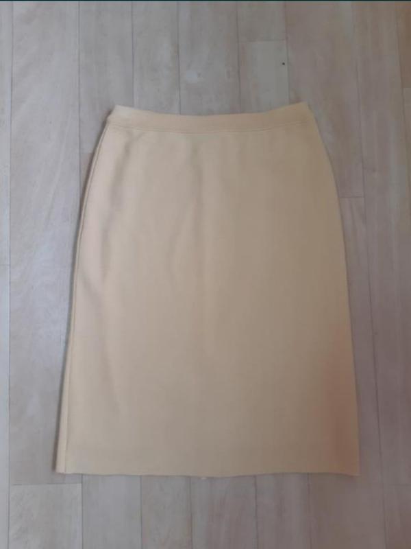 Теплая трикотажная юбка светло-горчичного цвета. Разм.42/XL/50. На подкладке. Разрез сзади. Пояс-гумка. ПОТ-39 см, ПОБ-48 см. Хорошо тянется. Длина-63 см. Состав: 50% шерсть, 50% акрил. Идеальное состояние