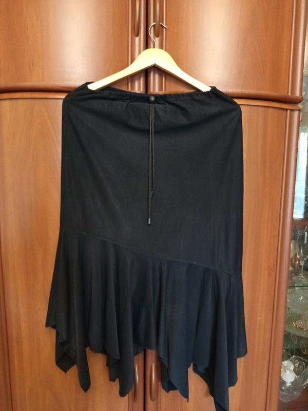 Спідниця — годе чорного кольору, виготовлена з трикотажу на дотик (бірка зрізана), на талії затягується на шнурок.Тканина тягнеться на 10 см по стегнах.Ніз спідниці виготовлений із відрізної оборки різної довжини. Заміри спідниці: ПОТ-43 см (+5 см тягнеться), НОС-52 см (+ 10 см тягнеться), довжина виробу — 80 і 90 см.