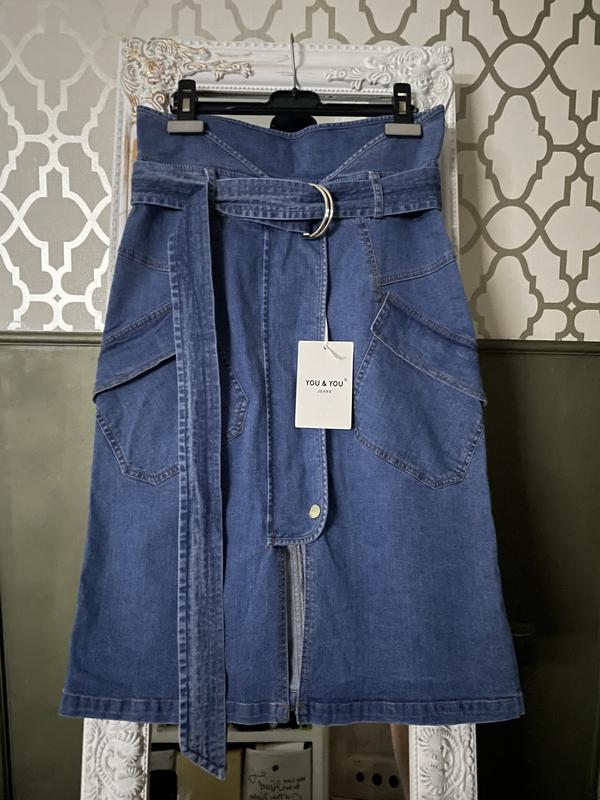 Джинсова спідниця міді з поясом. Застібається на блискавку і кнопки