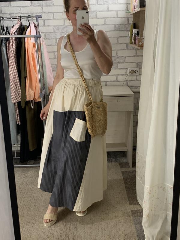 Спідниця цікавого крою, має безліч деталей, неординарна! Стан нової речі, гарного не бюджетного бренду! Бірка відсутня, але однозначно 100% котон Розмір вказаний S, ідеально на М По резинці 35( потягнеться до 50), стегна 70, довжина 92 см