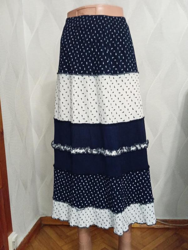 Спідниця легка, не просвічується, тканина не тягнеться. Заміри: півобхват талії 37 см, півобхват стегон 53 см, ширина по низу 99 см, довжина спідниці 75 см. Підійде на розмір Л, ХЛ. Стан ідеальний.