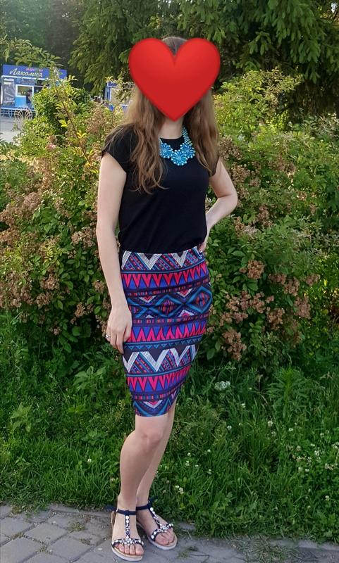 Юбка в идеальном состоянии. Ткань микродайвинг, очень красиво тянется. Длина миди. Все замеры на фото. Сзади без орнамента, просто черная. Размер С/М.