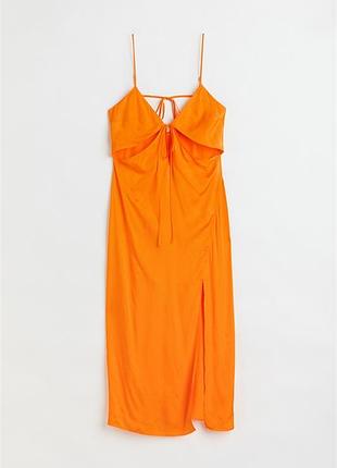 Приталена сукня довжиною до литок з м’якої драпірованої легкої віскозної саржі з блиском. Регульовані дуже вузькі лямки, глибокий V-подібний виріз спереду та глибокий виріз ззаду з горизонтальними зав’язками вгорі. Вирізи під грудьми з вузькими зав’язками по центру. Високий розріз з одного боку спереду. Без підкладки.