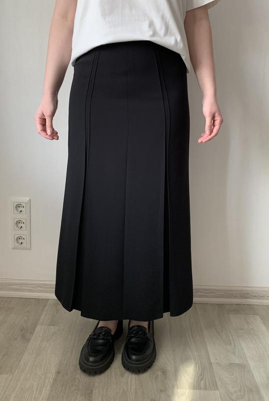 Спідниця довжини міді, чорного кольору На розмір М Довжина 93 см, напівобхват талії 38 см, напівобхват стегон 52 см Стан ідеал Вдягнуто на розмір Л, зріст 167