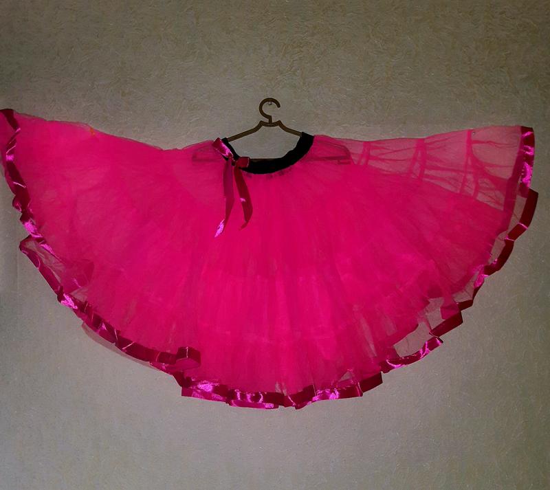 Шикарна та дуже пишна спідничка-пачка рожевого кольору із фатина з атласними лентами. Пояс- резинка,напівоб'єм талії= 37 см,,міряла резинку в спокійному нерозтягнутому стані. Довжина спіднички з резинкою= 65 см. В ідеальному стані 🤩🔥
