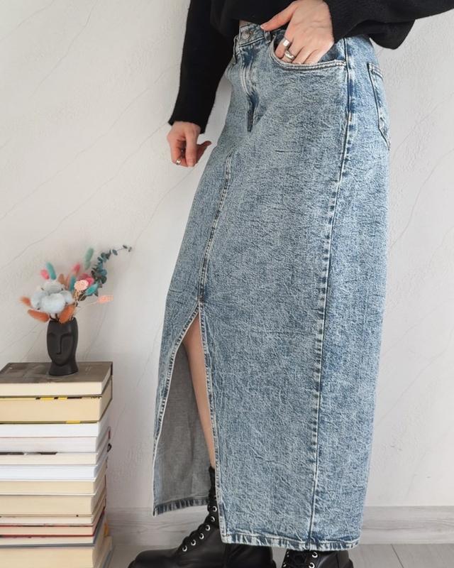 Джинсова спідниця-міді від ASOS з ефектом midwash, потертостями та розрізом. Спідниця має класичну джинсову текстуру та універсальний колір, що робить її чудовим варіантом для будь-якого випадку. Розмір: UK 10 = S-М. Заміри: талія 70 см, стегна 94, довжина 92 см(розріз 40 см) Примітка: мої параметри – талія 63 см, стегна 93 см, зріст 170 см. На мене падає на стегна. На свій розмір сяде на талію Склад: 99% бавовна, 1% еластан.