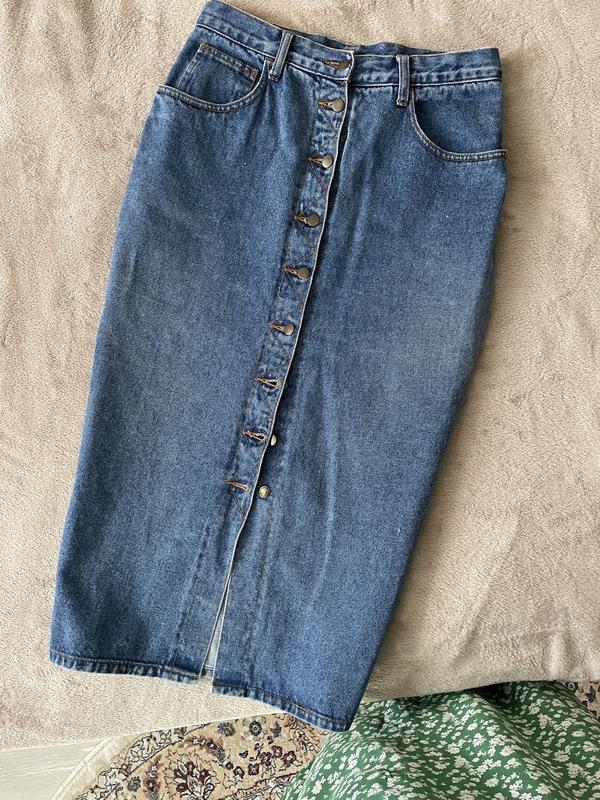 Джинсова спідниця з застібкою на гудзики довжини міді в хорошому стані, розмір М-Л) Півобхват талії - 36 см Півобхват стегон - 49 см Довжина - 77,5 см Матеріал - цупкий джинс)