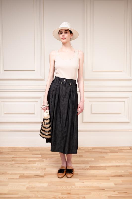Трендовая модель юбки из лекого хлопка, что своей текстурой напоминает джинс. Стилизованная защипами, фурнитурой и карманами