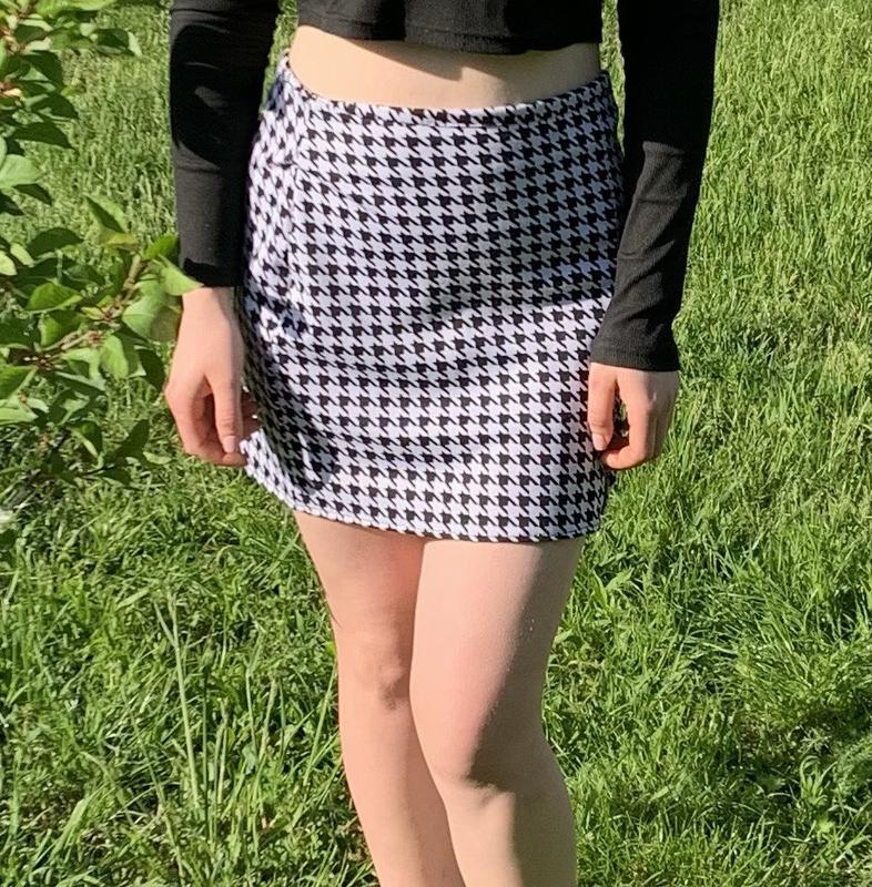 Стан: нова / одягалась 1 раз Приятная к телу ткань ✨ Актуальный черно-белый узор "гусина лапка" ✨ Красиво садится по фигуре ✨ Модный фасон – подходит к рубашкам, водолазкам, жакетам Можно носить с колготками, высокими сапогами или кедами Замеры: • Длина: 37 см • Талия: 36 см • Стегна: 42 см