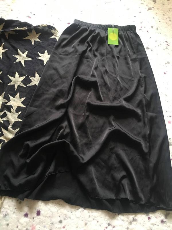 Новая черная шелковистая юбка Ткань легкая, струящаяся Талия на резинке Длина 82 см ПОТ 30-44 см ПОБ 50 см ПО низу 80 см
