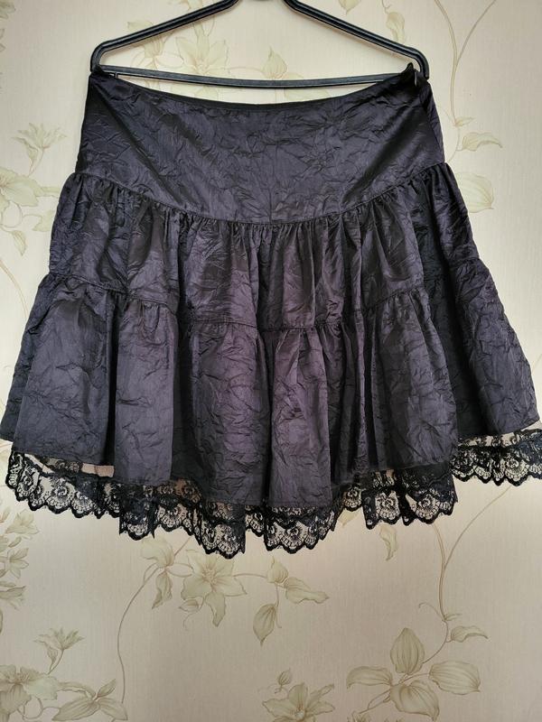 Юбка выполнена из двух видов черного атласа, жатого и гладкого из которого сделана подкладка кокетки. По низу юбки выполнен волан с удерживающей формой фатина, и украшен кружевом из органзы, это добавляет юбке объема внизу. Застегивается юбка на потайную молнию, аккуратный индивидуальный пошив с отделкой швов зигзагом. Полуобхват талии 39.5 возможно носить чуть ниже талии на бедрах. Длина изделия 53 см. Бедра свободно потому что великолепие максимально. Цвет ровный черный, камера немного подсвечивает, в реале просто черная.