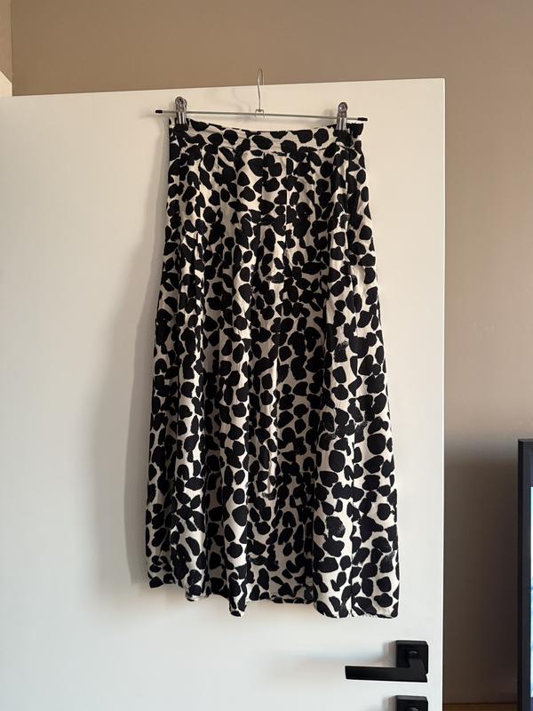 Міді спідниця з принтом з симетричними розрізами по двох боках. Розмір xs (34) Легка тканина. Стан: як нова, без дефектів та затяжок. Талія напівобʼєм: 33 см Довжина: 78 см Кольори: чорні точки на бежевому фоні.