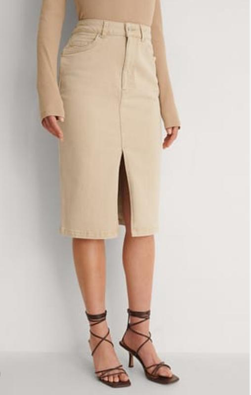 Прохання через кнопку КУПИТИ оформлювати після домовленності Стильная юбка миди по фигуре Na-Kd. Красивый бежевый цвет, джинсовая ткань. Спереди небольшой разрез. Сзади накладные карманы. Застежка на молнию и пуговицу. Размер указан 38. Новая, без бумажной бирки