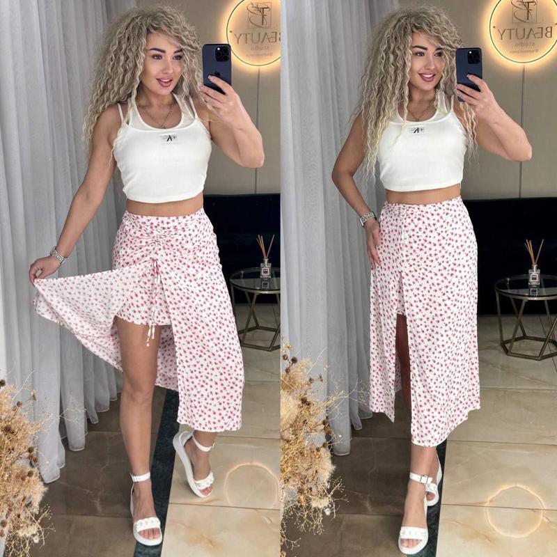 Спереди разрез, есть кулиска, которая регулируется Модель:2435 rusl Размеры (42-44), (46-48) Тканина:штапель Замеры 📌Обхват талии (42-44)-64см, (46-48) -70-90см 📌Обхват стегон (42-44)-100см, (46-48)-102см 📌Длина 39-78см