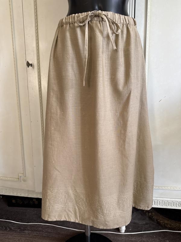 Чудова спідниця міді бежевого кольору. По талії гумка-кулиска, по низу купоном машинна вишивка гладдю. Склад:льон/котон(60/40). Без підкладки, без карманів. Розмір по бірці-М.Заміри: довжина-76 см, ПОТ-38 см, ПОБ-49 см. Стан нової речі.