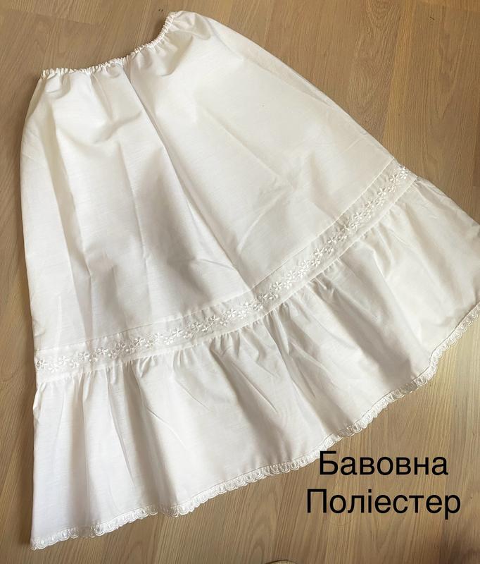 Якісна ,біла спідниця з котону та полієстеру. S xs Заміри; довжина 64см,обхват талії 60-78см, бедра ширина 55см. Ажур по низу та вишивка. Стан нової.