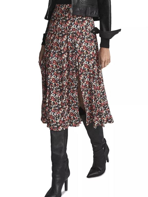 Идеальное, состояние новой вещи. Актуальная женская юбка средней длины миди в мелкий цветочный принт. Юбка на кокетке, пояс подбит репсовой лентой. А-силуэта (трапецией, клеш), имеет среднюю посадку, с переда четыре складки. Сзади застежка-молния. Ткань качественная, средней плотности, легкая, дышит, красиво драпируется. Благодаря кокетке скрывает животик и очень красиво садится по фигуре. Идеальна для лета, а также на теплую осень и весну. Бренд REISS-премиальный бренд из Великобритании, создает стильные и элегантные вещи. Размер EU 42 (наш 48), четко соответствует. На размер 46 можно немного приспустить на бедра. Состав-55% вискоза, 45%-рейон (аналогическая вискозе), ткань вобрала в себя свойства хлопка и шелка ПОТ 41, высота кокетки с поясом 18, ПО по низу кокетки 53, длина 76 Разрез застрочен. Очень аккуратно, ювелирно, как так и было, не отличается. словами это как человек, который шьет.