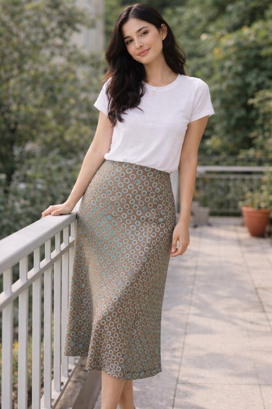 Спідниця з віскози з геометричним принтом, цікаве поєднання коричневого і бірюзового кольорів. Стан нової речі. На Л/ХЛ. Гарно сяде на обʼємні стегна. Довжина 66 Напів обʼєм по резинці в поясі 37, В стегнах 55 тягнеться до 62