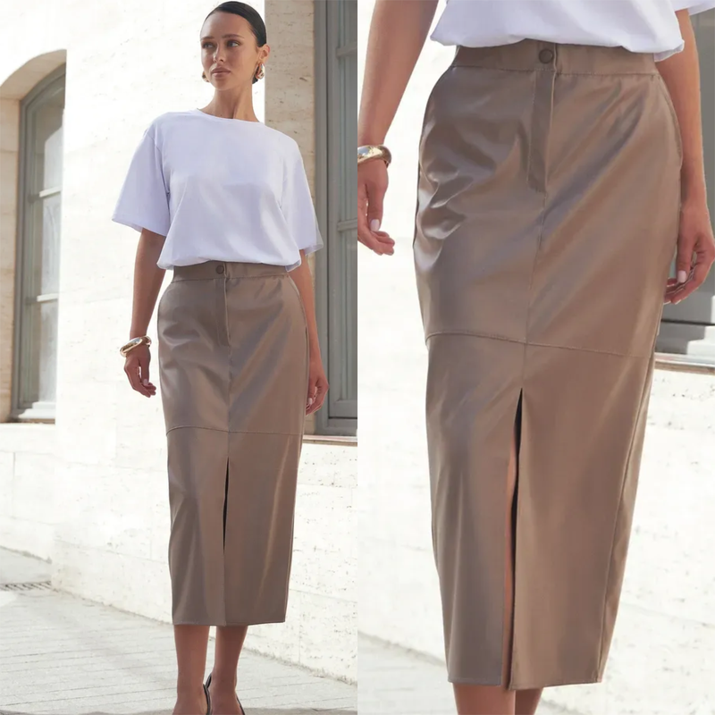 Кожаная юбка миди прямого кроя с разрезом спереди 3 цвета