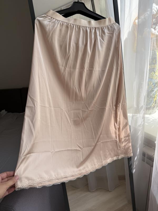 Новий атласний підʼюник, на резинці, знизу декорований ніжним, тонким мереживом. Колір беж. По бірці розмір L. Заміри: По резинці в спокійному стані пів обхват 38 см, тягнеться до 60 см. Довжина збоку: 76 см Пів обхват стегна: 62 см.