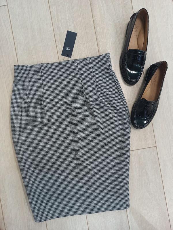 Спідниця-олівець, міді, нова, завищена талія, трикотажне полотно, з розрізом позаду, віскоза-поліестер-еластан, принт гусяча лапка, колір чорно-білий. Marks& Spencer. Розмір С-М. Заміри: ОТ 76-78, ОБ 100-106, довжина 61.