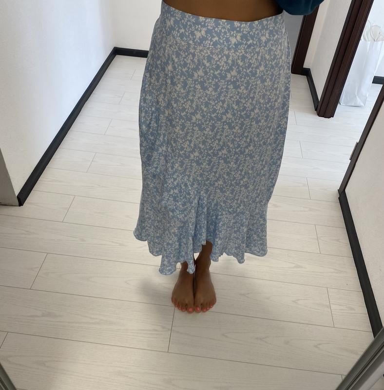 Юбка миди летняя голубая, цветочный принт, Размер S Пояс на резинке Состав: 100% полиэстер Полуобхват бедер по швам спереди 46 см (свободный крой) Полуобхиат талии 36 см Длина изделия 82см