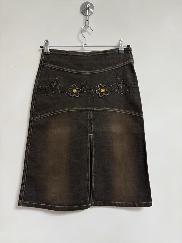 Джинсовая юбка трапециевидного кроя с разрезом посередине и вышивкой бисером. Сбоку застегивается на змейку Стиль ретро Производитель Турция Арт 075533 Размер: - S - длина 61 см, ПО талии 35 см, ПО бедер 44 см Ткань стрейчевая