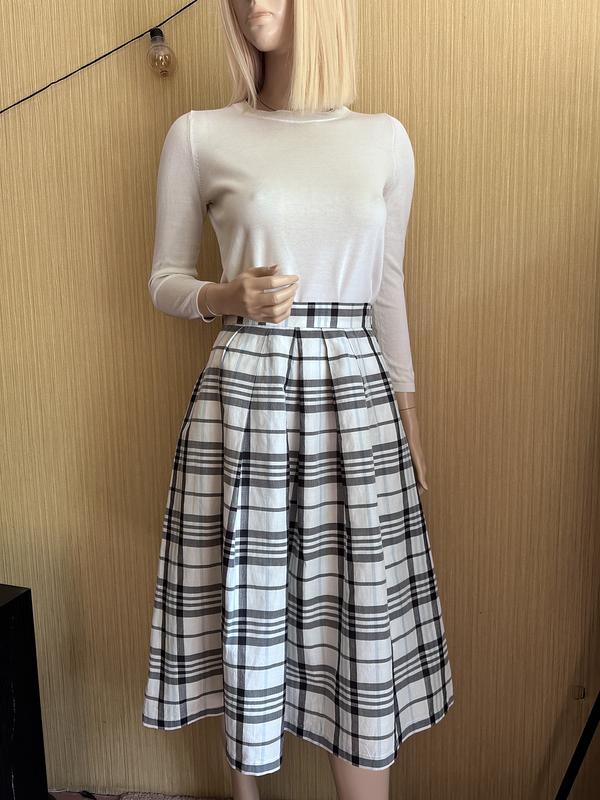 Шикарна спідниця в клітинку. Оригінал. Тканина легка, щільна, натуральна. На підкладці. В складі бавовна і рамі( натуральна тканина з кропиви, еквівалент льону). Стан нової. Розмір вказано S-M Довжина 71 По пояса 35 По стегон 61 в спокійному стані