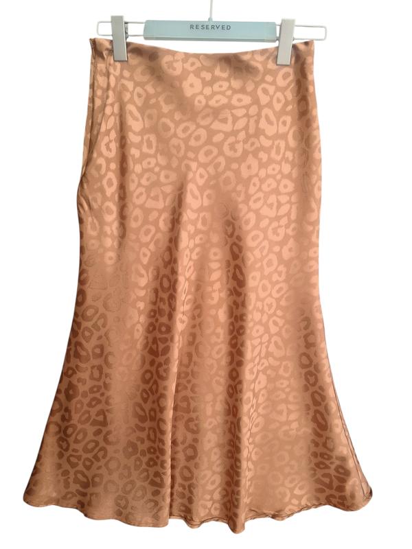Сатиновая юбка из жаккарда с леопардовым плетением, р. S. Замеры на фото. Цвет персиково-бежевый. На молнии, с подкладкой. Тканина струмлмва, легка, шовковиста. Строй идеален, но есть несколько мини-зацепок с правой стороны, на последнем фото успела показать.