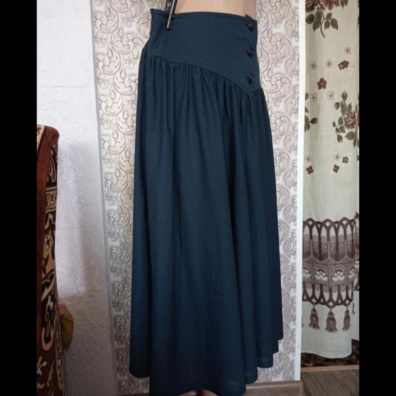 Юбка темно-синего цвета с высокой талией. Юбка свободного кроя,сзади на талии-резинка.Спереди с пуговицами.Отлично будет смотреться с белым верхом. Состав: полиэстер. Состояние идеальное. Размер указан 3. Ориентируйтесь на замеры. Замеры:ПОТ-41 см(резинка);ПОБ-60 см; ПО низа-114 см;длина-72 см. Фото на теле нет. Пересылка.