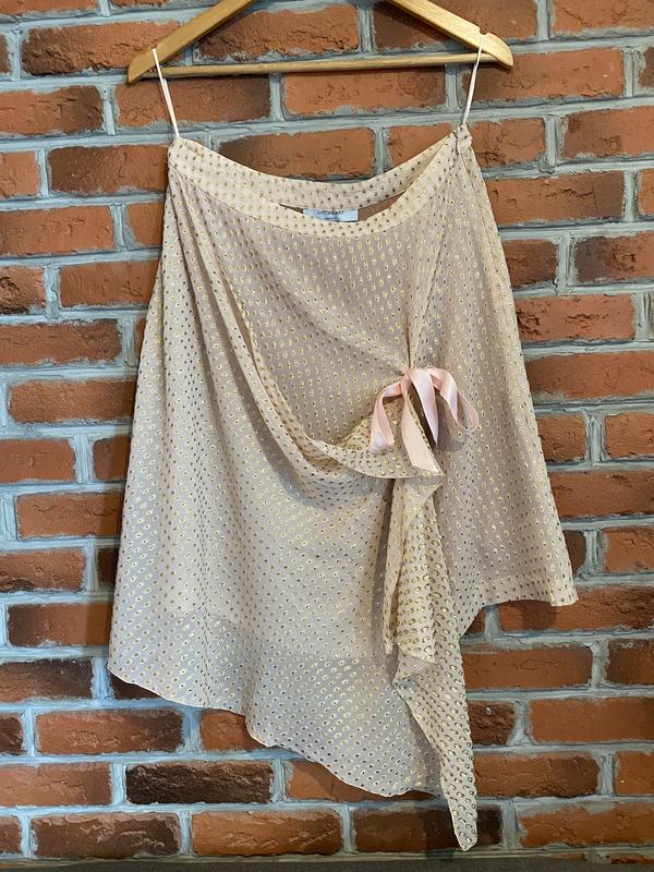Нова оригінальна шовкова спідниця Viktor & Rolf. Спереду асиметрична з декором. Колір бежево-рожевий із золотими люрексовими краплями. Розміри: Півобхват талії - 40 см Довжина спідниці - 53 см ( + 20 см рюшки спереду)