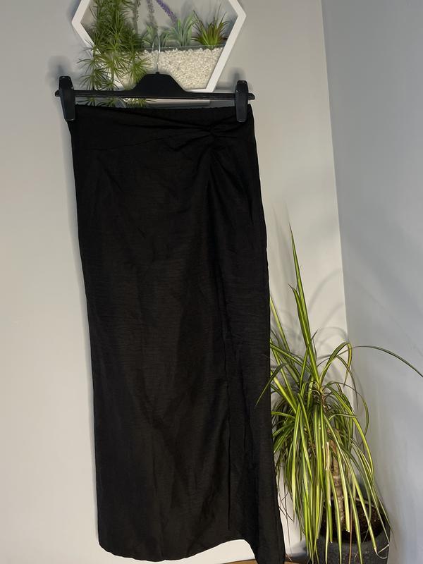 Спідниця з розрізом на нозі Пояс заді на резинці , що дуже зручно В ідеальному стані Без слідів експлуатації Додаткові фото на тілі можу вислати Розмір S Напів обʼєм талії 34см тягнеться до 41см Напів обʼєм бедра 49см Довжина 97см