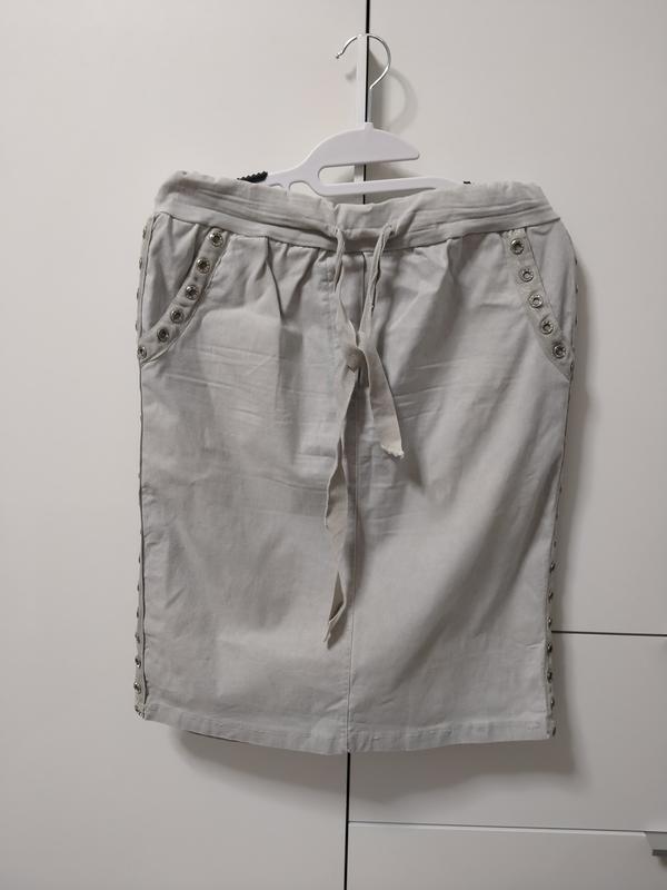 Юбка коттоновая с декором по бокам. Цвет - серый. Без нюансов Длина 58 см ПОТ 39 см на резинке ПОС 50 тянется к 54